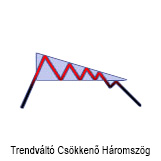 Ahhoz, hogy trendváltó alakzatról beszéljünk, egy trendnek már fent kell állnia. A Trendváltó Csökkenő Háromszög esetén az árfolyam itt alulról lép be az alakzatba, szemben a trenderősítő csökkenő háromszöggel.