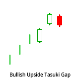 A Bullish Upside Tasuki Gap rendkívül ritka alakzat. A minta első két gyertyájának a teste körülbelül azonos méretű. A Bullish Upside Tasuki Gap alakzat meglehetősen hasonlít a Bullish Upside Gap Three Methods alakzathoz. Az egyetlen különbség, hogy az első két nap által hagyott rést a Bullish Upside Gap Three Methods alakzat kitölti. A minta megbízhatósága közepes, így szükséges a megerősítése. A konfirmáció lehet egy fehér gyertya felfelé irányuló réssel, vagy magasabb záróárral.
